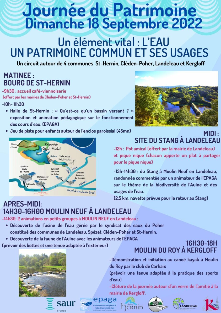 Le 18 septembre, retrouvez l’EPAGA lors de la journée du patrimoine autour de 4 communes : Saint-Hernin, Cléden-Poher, Landeleau et Kergloff.  Au programme : L’eau, un patrimoine sous surveillance. Matinée: découverte du fonctionnement d’un bassin versant et de l’importance du paysage pour la préservation ressource en eau à partir d’une maquette en 3D. Sensibilisation à…