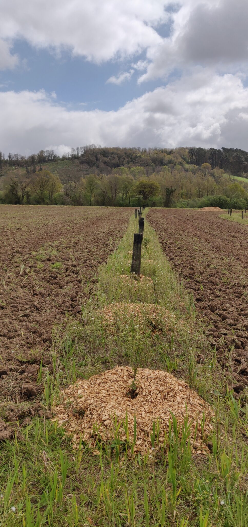 - Maintenir l’humidité au pied de l’arbre, en réduisant l’évapotranspiration ce qui limite les dégâts lors des sècheresses : en 2022, seulement 10% de mortalité sont observés sur les jeunes arbres paillés !