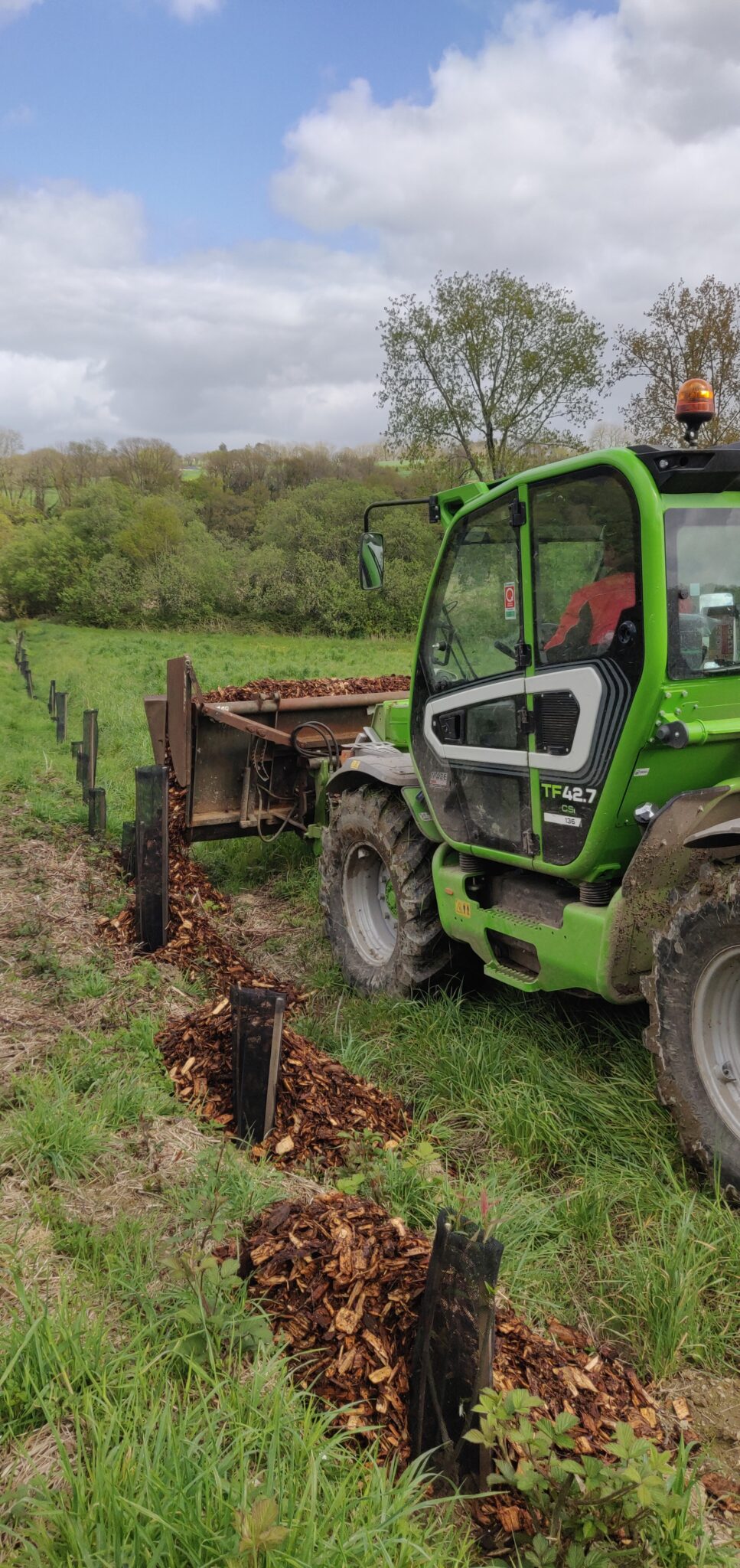 L’entreprise @YG paysage dépose des copeaux de bois sur 10 cm d’épaisseur autour de l’arbre à l’aide d’un tracteur. Le bois est issu de chantiers de broyage présents sur le territoire. Ces travaux s’inscrivent dans une opération globale de replantation de haies, et sont de ce fait, pris en charge financièrement par le programme #Breizh bocage (financé par la @Région Bretagne, le @département du Finistère et l’Europe) ainsi que par l’EPAGA.