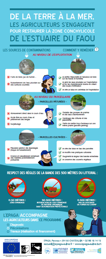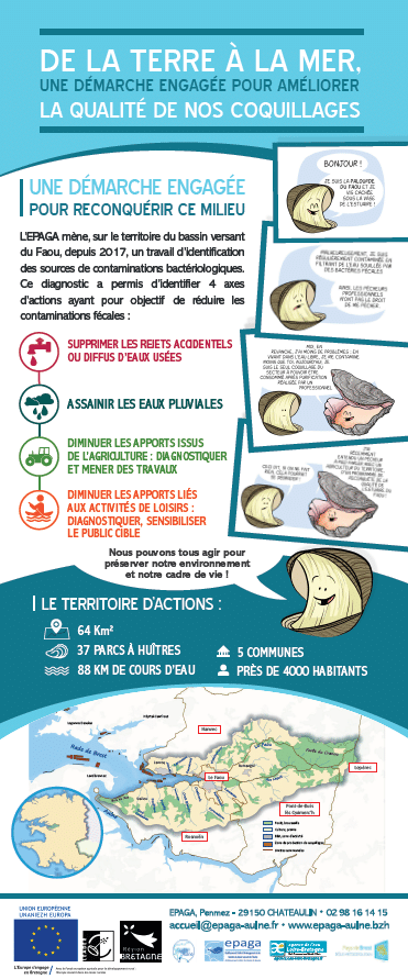 Depuis 2017, l’EPAGA a réalisé des diagnostics sur l’ensemble du bassin versant du Faou pour déterminer les sources potentielles d’apports en bactéries fécales aux cours d’eau puis dans l’estuaire. Les communes concernées par cette étude sont : Le Faou, Rosnoën, Pont-de-Buis, Hanvec et Lopérec. Parallèlement à ces observations, de nombreux prélèvements d’eau ont été réalisés et de nombreux acteurs du territoire ont été rencontrés.